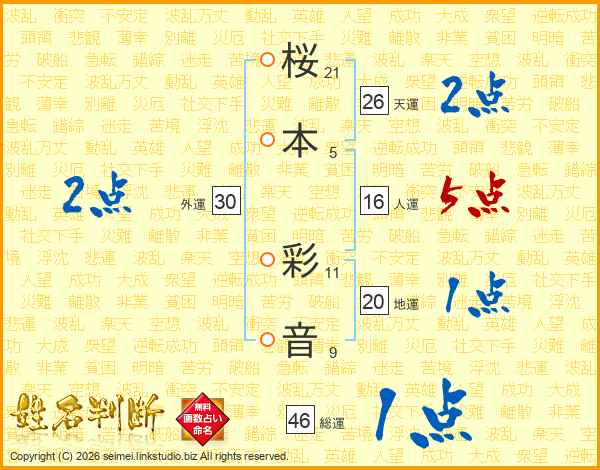 桜(21画)本(5画) 彩(11画)音(9画)
