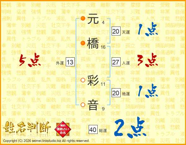 生活面を象徴する運勢です。外部から受ける影響力を表し、結婚運、家庭運や職場、環境への順応性を表します。総運から人運を引いた画数。姓や名が1文字の場合を除く。