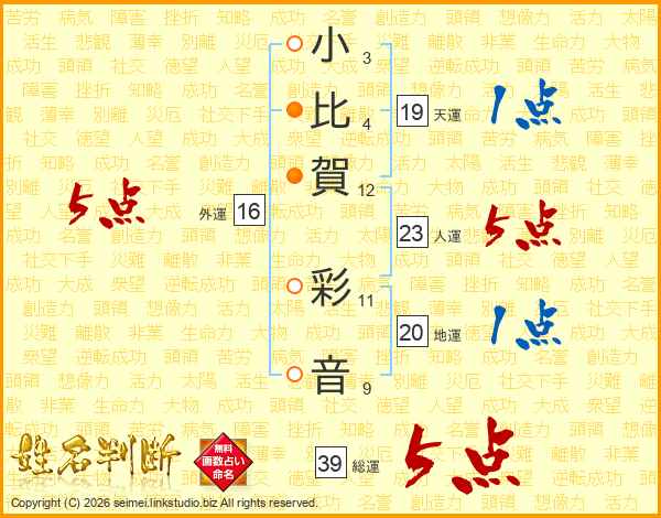 小(3画)比(4画)賀(12画) 彩(11画)音(9画)