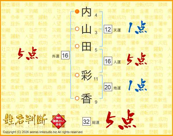 内(4画)山(3画)田(5画) 彩(11画)香(9画)