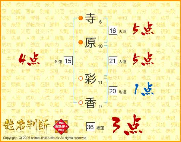 生活面を象徴する運勢です。外部から受ける影響力を表し、結婚運、家庭運や職場、環境への順応性を表します。総運から人運を引いた画数。姓や名が1文字の場合を除く。