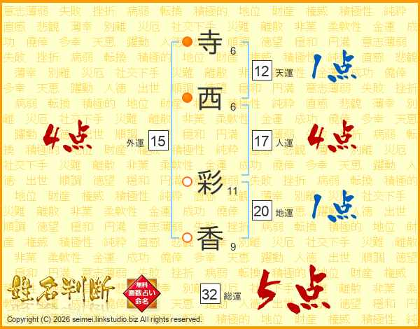 生活面を象徴する運勢です。外部から受ける影響力を表し、結婚運、家庭運や職場、環境への順応性を表します。総運から人運を引いた画数。姓や名が1文字の場合を除く。