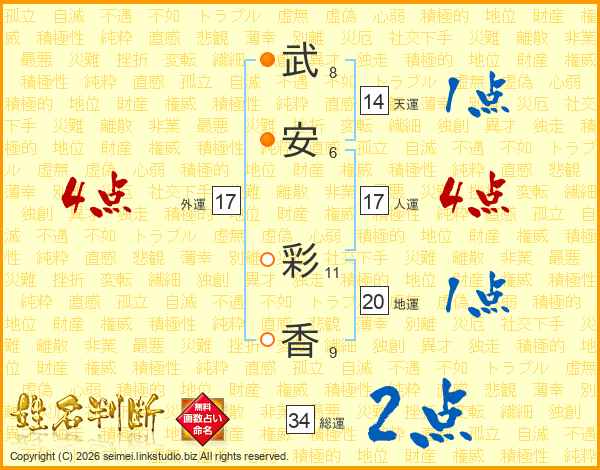生活面を象徴する運勢です。外部から受ける影響力を表し、結婚運、家庭運や職場、環境への順応性を表します。総運から人運を引いた画数。姓や名が1文字の場合を除く。