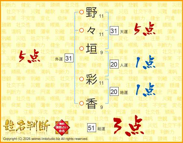 野(11画)々(11画)垣(9画) 彩(11画)香(9画)