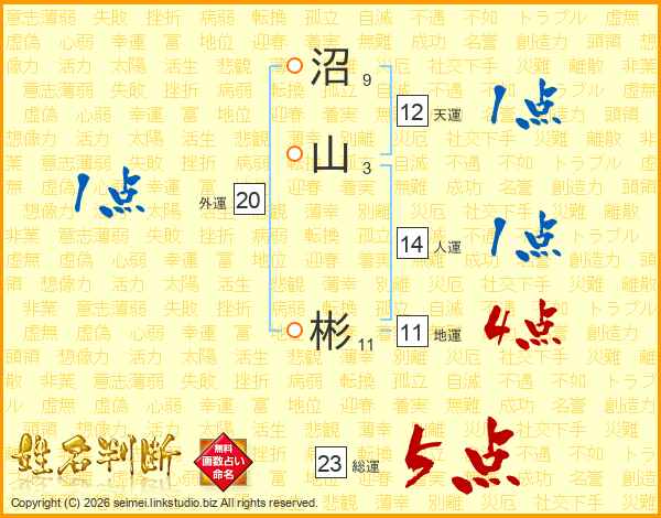 沼山彬さんの総運は23画の5点!