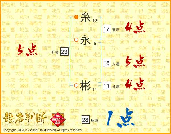 生活面を象徴する運勢です。外部から受ける影響力を表し、結婚運、家庭運や職場、環境への順応性を表します。総運から人運を引いた画数。姓や名が1文字の場合を除く。