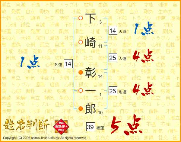 下(3画)崎(11画) 彰(14画)一(1画)郎(10画)
