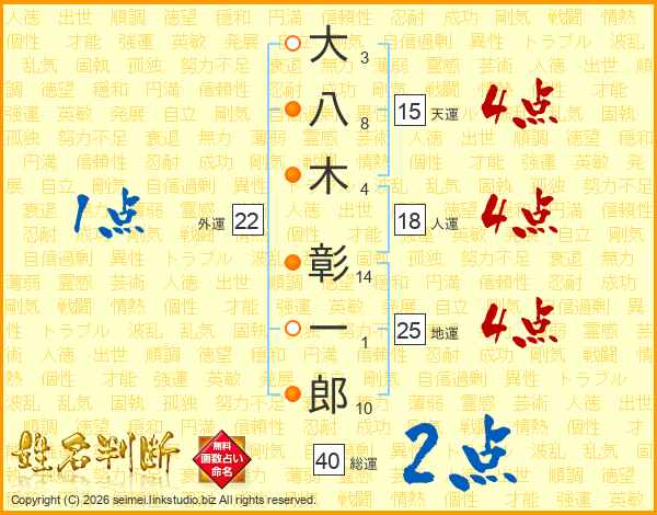 大(3画)八(8画)木(4画) 彰(14画)一(1画)郎(10画)