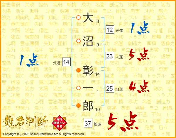 大(3画)沼(9画) 彰(14画)一(1画)郎(10画)