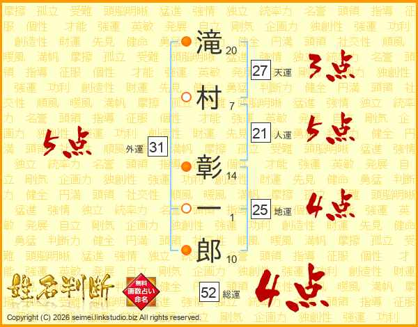 滝(20画)村(7画) 彰(14画)一(1画)郎(10画)