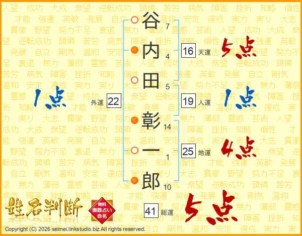 谷(7画)内(4画)田(5画) 彰(14画)一(1画)郎(10画)
