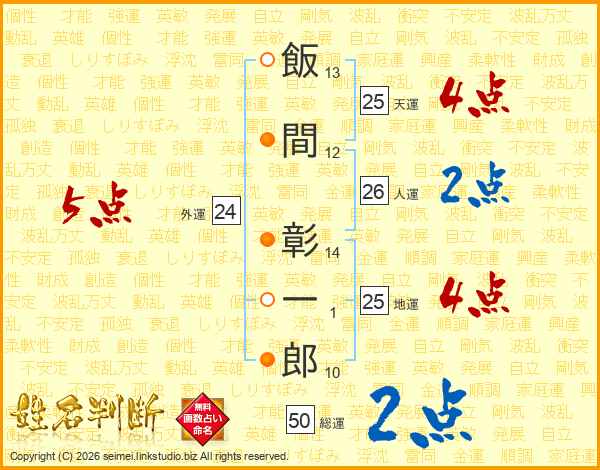 飯(13画)間(12画) 彰(14画)一(1画)郎(10画)