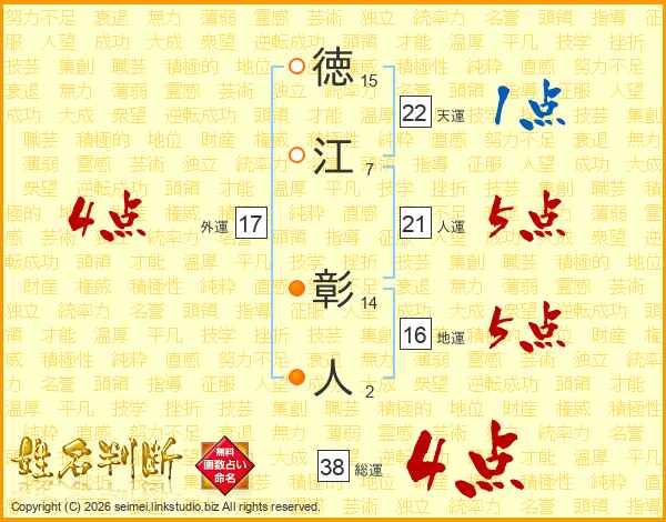 生活面を象徴する運勢です。外部から受ける影響力を表し、結婚運、家庭運や職場、環境への順応性を表します。総運から人運を引いた画数。姓や名が1文字の場合を除く。