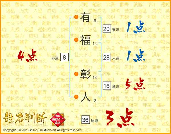 生活面を象徴する運勢です。外部から受ける影響力を表し、結婚運、家庭運や職場、環境への順応性を表します。総運から人運を引いた画数。姓や名が1文字の場合を除く。