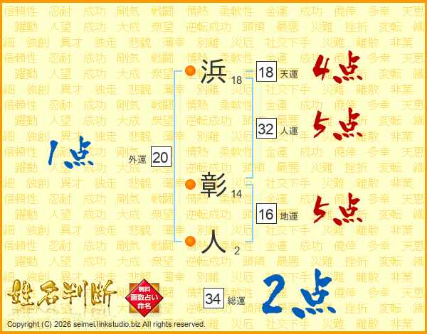 あなたの人生を表す1番重要な運勢です。生涯を通じて影響する総合運となり、主に50歳以降の晩年期に影響を及ぼします。苗字と名前の合計画数。