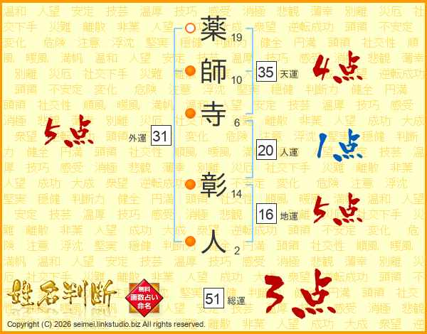 薬(19画)師(10画)寺(6画) 彰(14画)人(2画)