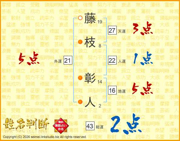 藤(19画)枝(8画) 彰(14画)人(2画)