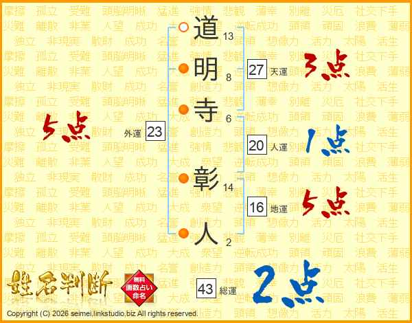道(13画)明(8画)寺(6画) 彰(14画)人(2画)