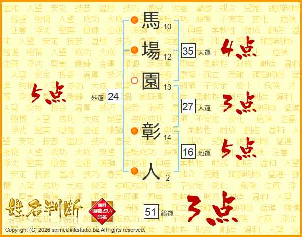 馬(10画)場(12画)園(13画) 彰(14画)人(2画)