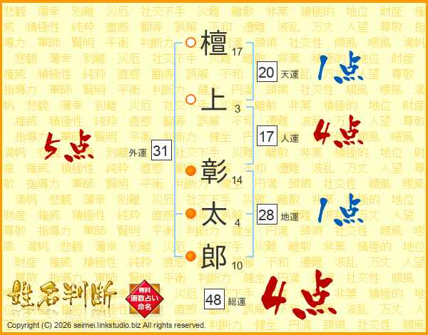 檀(17画)上(3画) 彰(14画)太(4画)郎(10画)