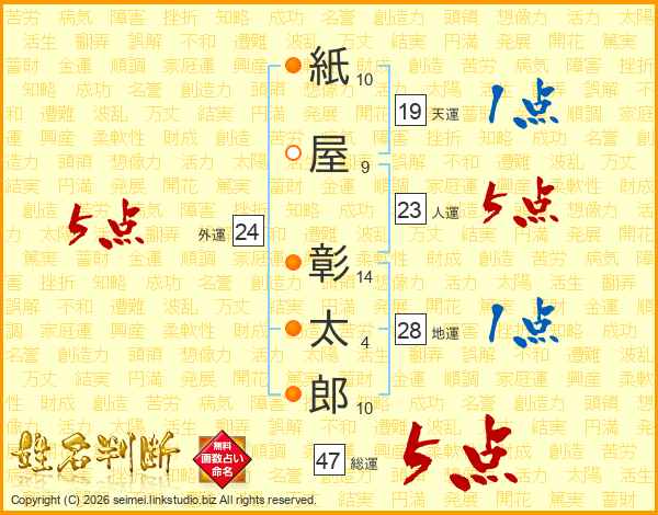 紙(10画)屋(9画) 彰(14画)太(4画)郎(10画)