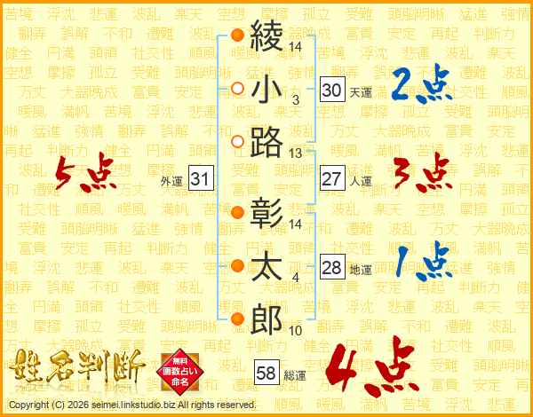 綾(14画)小(3画)路(13画) 彰(14画)太(4画)郎(10画)