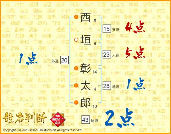 西(6画)垣(9画) 彰(14画)太(4画)郎(10画)