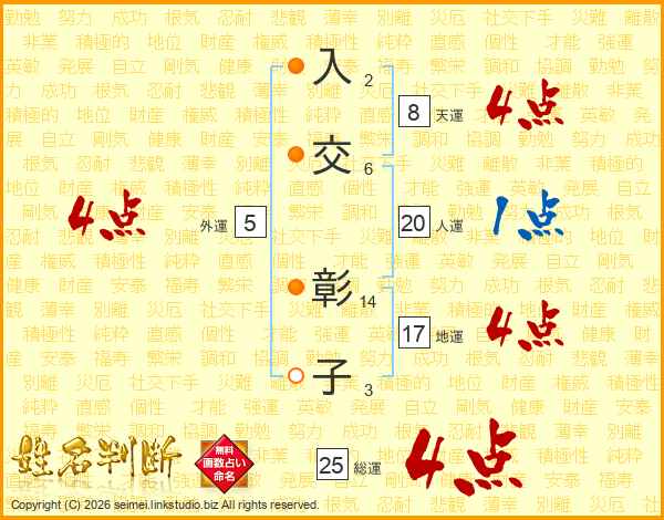 生活面を象徴する運勢です。外部から受ける影響力を表し、結婚運、家庭運や職場、環境への順応性を表します。総運から人運を引いた画数。姓や名が1文字の場合を除く。