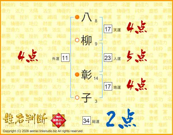 八(8画)柳(9画) 彰(14画)子(3画)