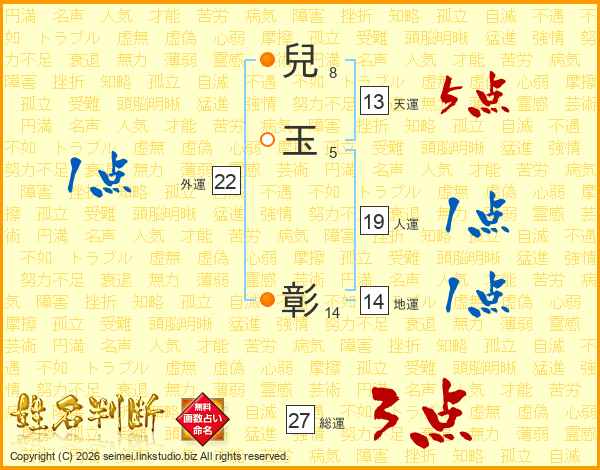 兒(8画)玉(5画) 彰(14画)