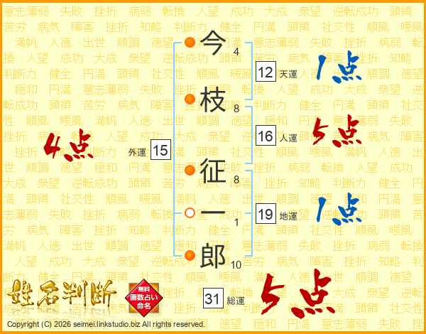 今(4画)枝(8画) 征(8画)一(1画)郎(10画)