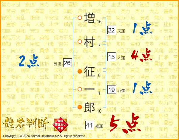 増(15画)村(7画) 征(8画)一(1画)郎(10画)