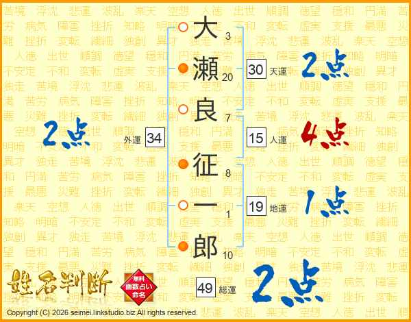 大(3画)瀬(20画)良(7画) 征(8画)一(1画)郎(10画)
