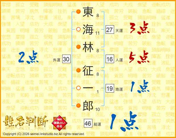 東(8画)海(11画)林(8画) 征(8画)一(1画)郎(10画)