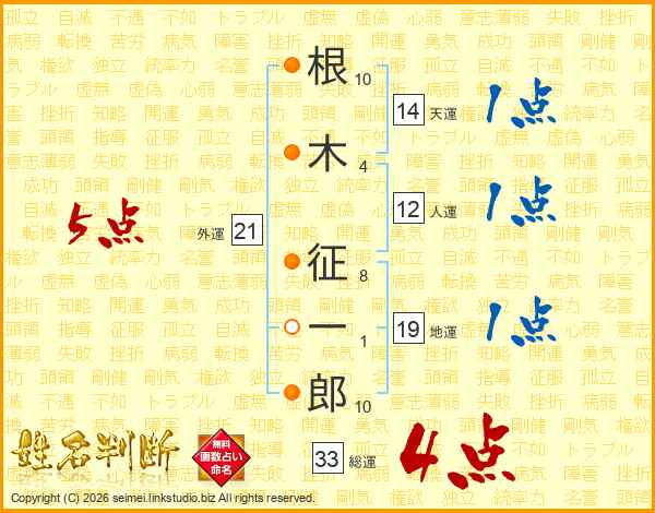 根(10画)木(4画) 征(8画)一(1画)郎(10画)