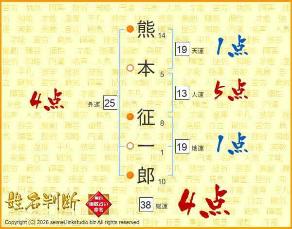 熊(14画)本(5画) 征(8画)一(1画)郎(10画)