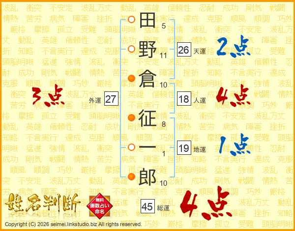 田(5画)野(11画)倉(10画) 征(8画)一(1画)郎(10画)