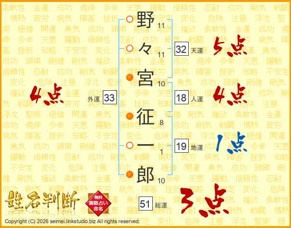 野(11画)々(11画)宮(10画) 征(8画)一(1画)郎(10画)