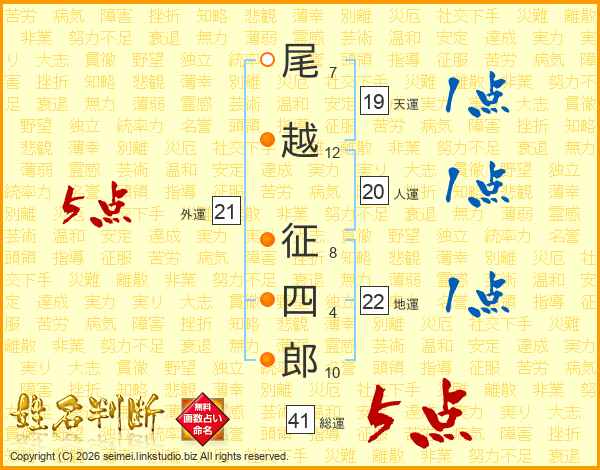 尾(7画)越(12画) 征(8画)四(4画)郎(10画)