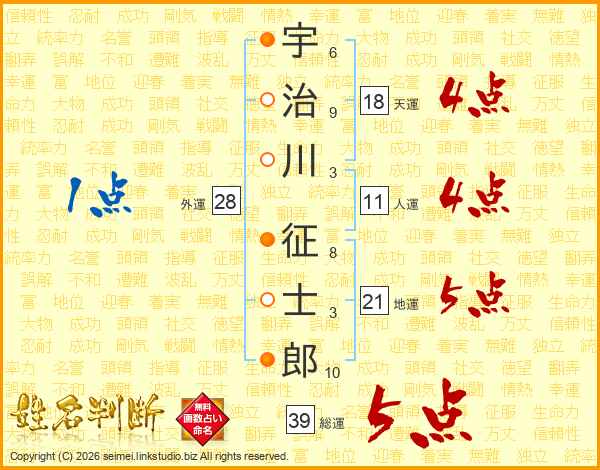 宇(6画)治(9画)川(3画) 征(8画)士(3画)郎(10画)