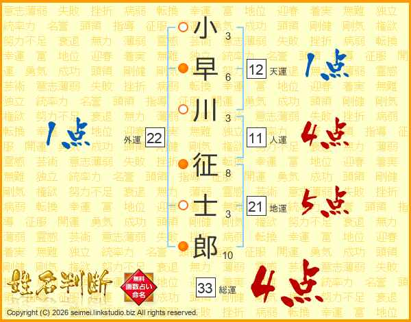小(3画)早(6画)川(3画) 征(8画)士(3画)郎(10画)