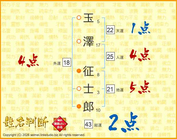 玉(5画)澤(17画) 征(8画)士(3画)郎(10画)