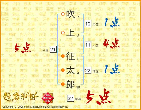 吹(7画)上(3画) 征(8画)太(4画)郎(10画)