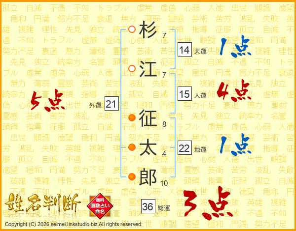 杉(7画)江(7画) 征(8画)太(4画)郎(10画)