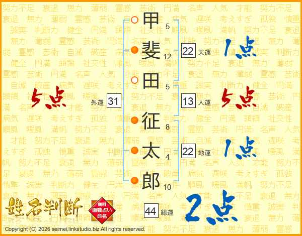 甲(5画)斐(12画)田(5画) 征(8画)太(4画)郎(10画)