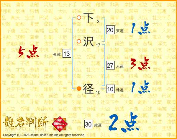 下沢径さんの人運は27画の3点!