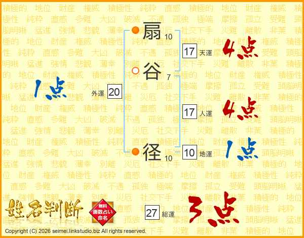 生活面を象徴する運勢です。外部から受ける影響力を表し、結婚運、家庭運や職場、環境への順応性を表します。総運から人運を引いた画数。姓や名が1文字の場合を除く。