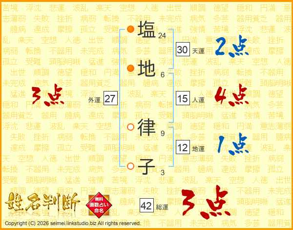 生活面を象徴する運勢です。外部から受ける影響力を表し、結婚運、家庭運や職場、環境への順応性を表します。総運から人運を引いた画数。姓や名が1文字の場合を除く。