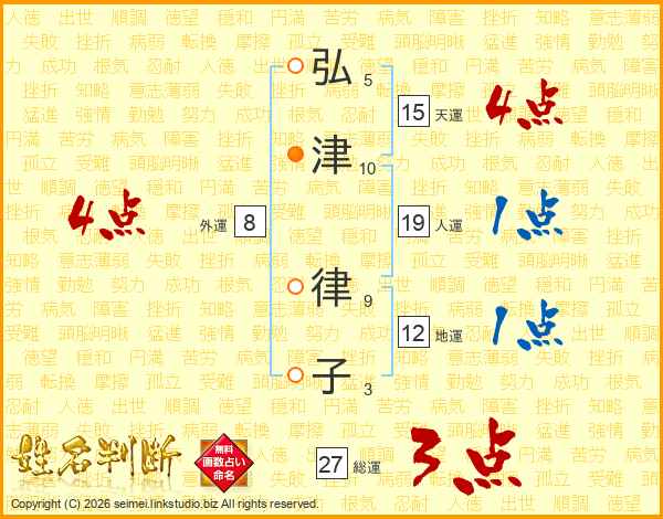 弘(5画)津(10画) 律(9画)子(3画)