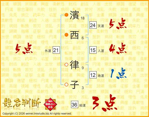 濱(18画)西(6画) 律(9画)子(3画)